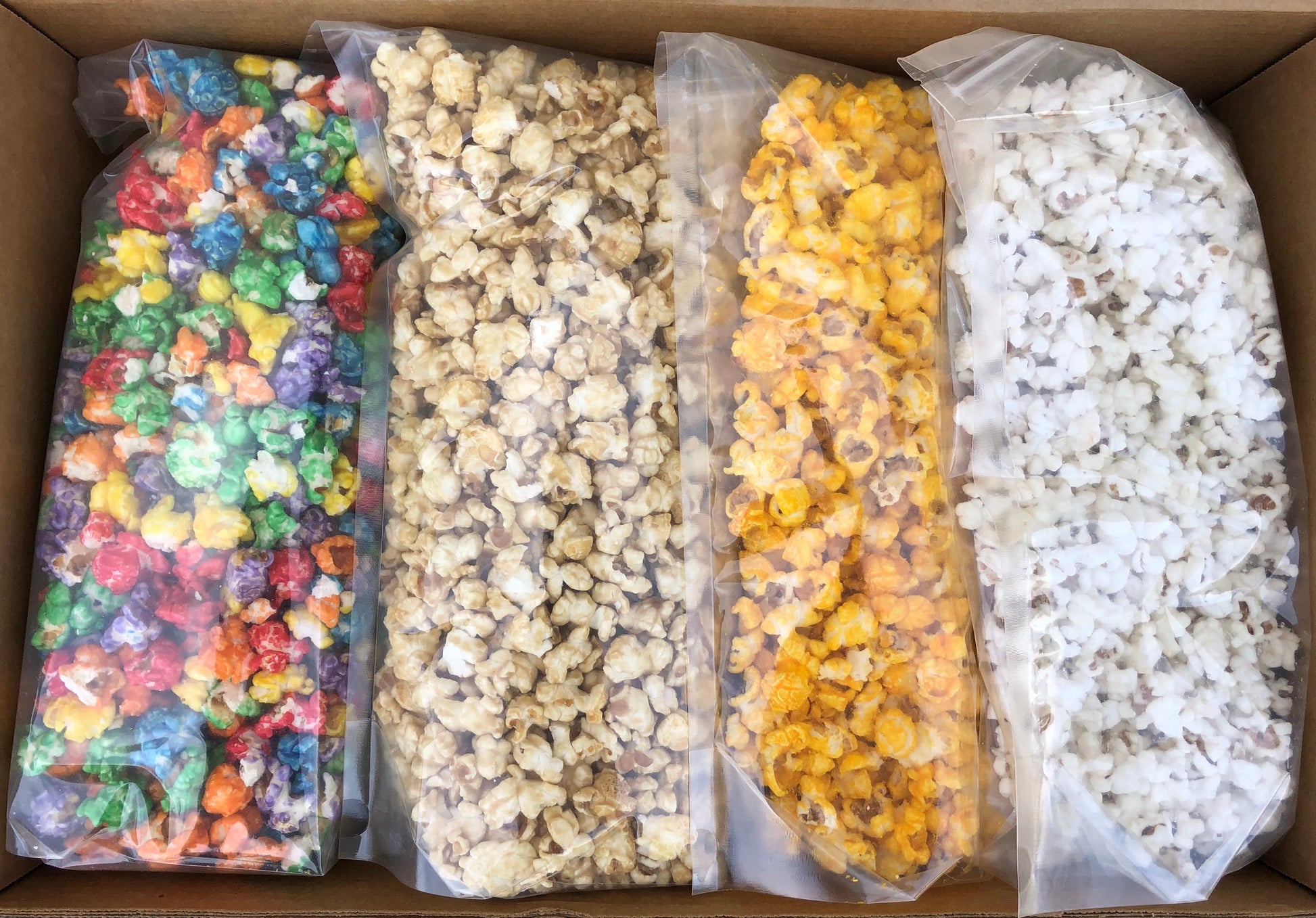 Each bag contains either 8oz or 16oz of popcorn, depending on the flavor (sugar-coated varieties like Caramel tend to weigh more than cheese or salted popcorn). Please note: Some settling may occur during shipping.